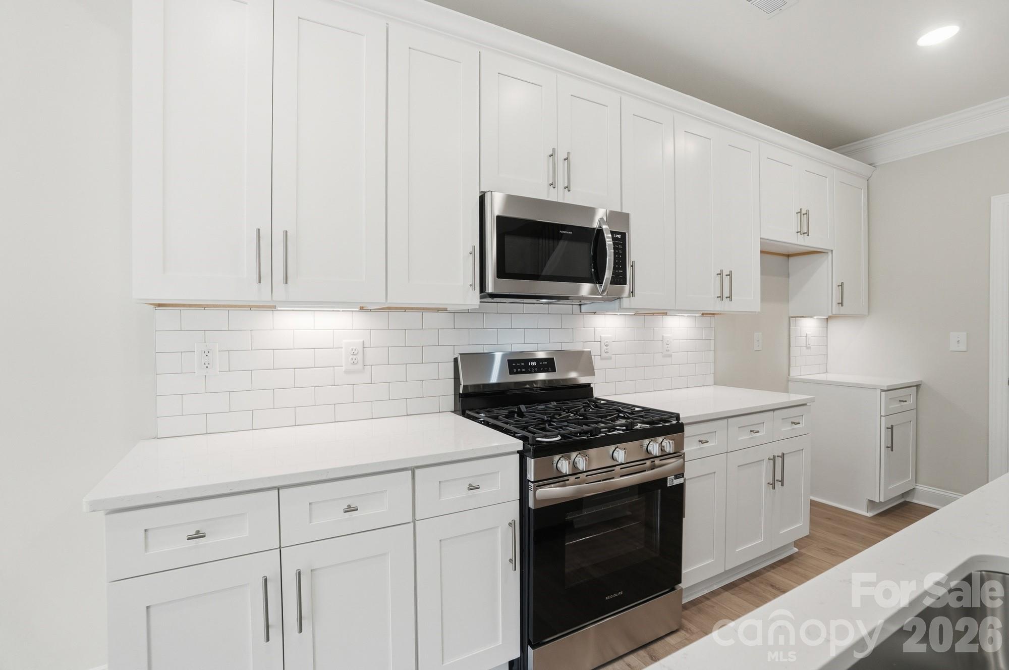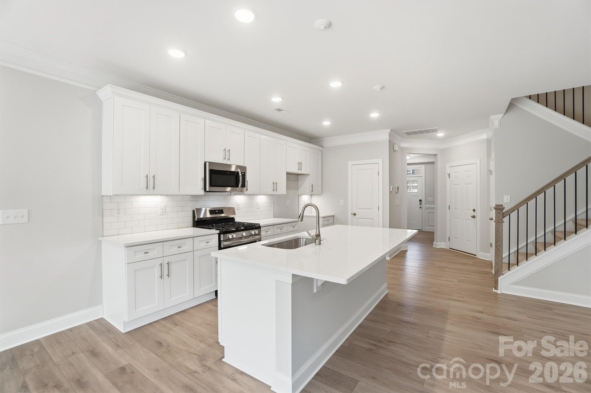 New townhomes in Harrisburg! This Ashland plan has 3 bedrooms, 2.5 baths, and more than 1,800 square feet of living space. The beautiful kitchen has Shaker-style, white cabinets, quartz counters, white tile backsplash, and stainless appliances, including a gas range. The kitchen opens into the dining area and family room. Stairs with metal balusters lead to the upper floor that has a loft, laundry room, two secondary bedrooms, a hall bath, and the spacious primary suite. The primary bath has a tiled shower with a bench seat, dual-sink vanity, and a linen closet. Additional extras include a foyer with tray ceiling and a built-in drop zone and quartz counters in all baths. This home has a rear covered porch and a privacy fence between rear yards. Community amenities feature a dog park, playground, paved walking trail, outdoor pool & cabana.