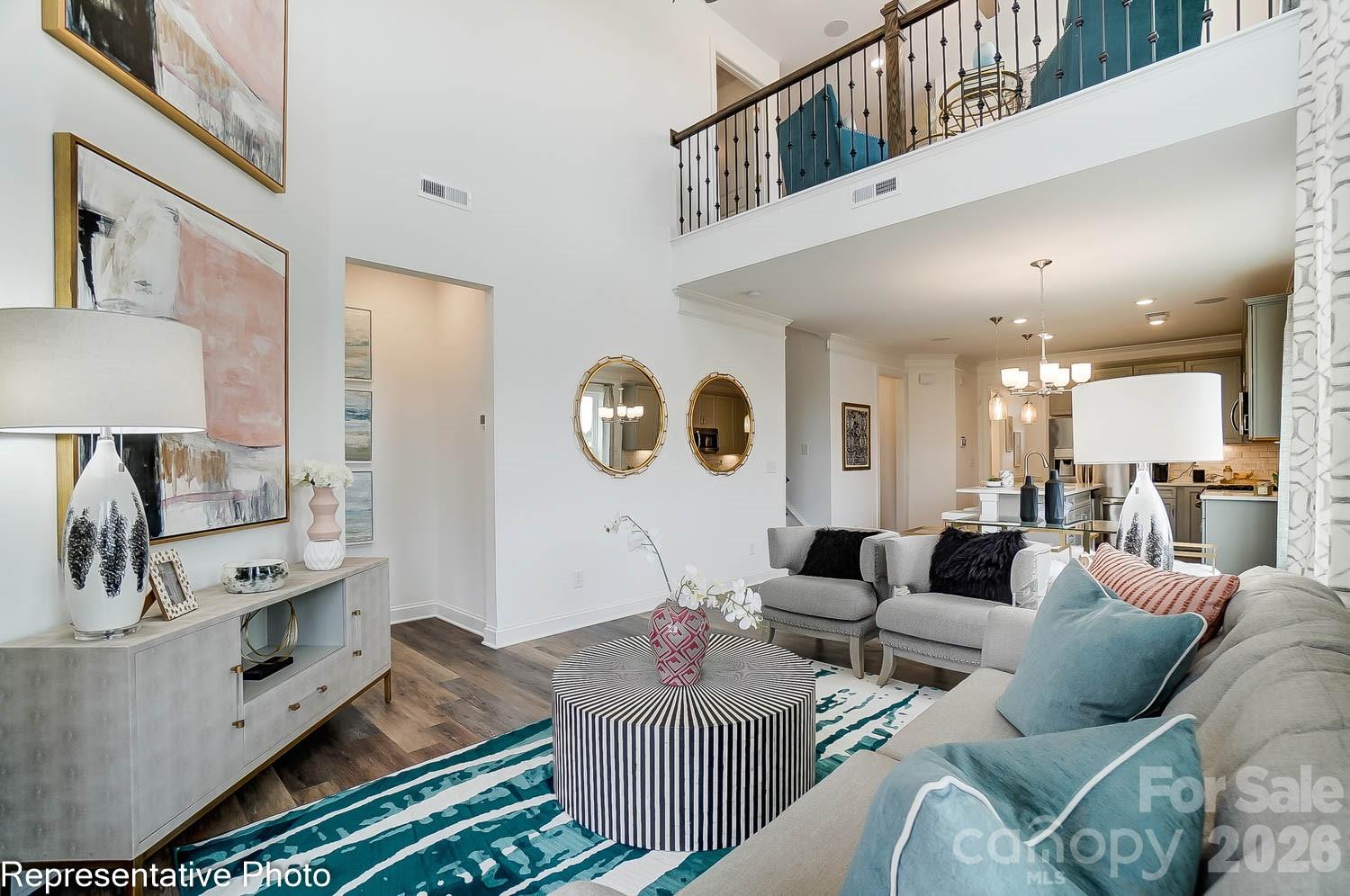 New townhomes in Harrisburg! This end-unit townhome features the primary suite on the main and a flex/bonus room on the upper floor. The home has a total of 3 bedrooms, 2.5 baths, and more than 1,900 square feet of living space. The kitchen features quartz counters, Shaker-style white cabinets, a tile backsplash, and stainless appliances, including a gas range. The open dining area and family room look out to the rear covered porch. The primary bedroom features a tray ceiling, and the primary bath features a tiled shower with bench seat and a double-sink vanity. The upper floor has a loft overlooking the family room, two additional bedrooms, a full bath, and a finished flex space/bonus room. Community amenities include a dog park, walking trails, a playground, outdoor pool, and cabana.