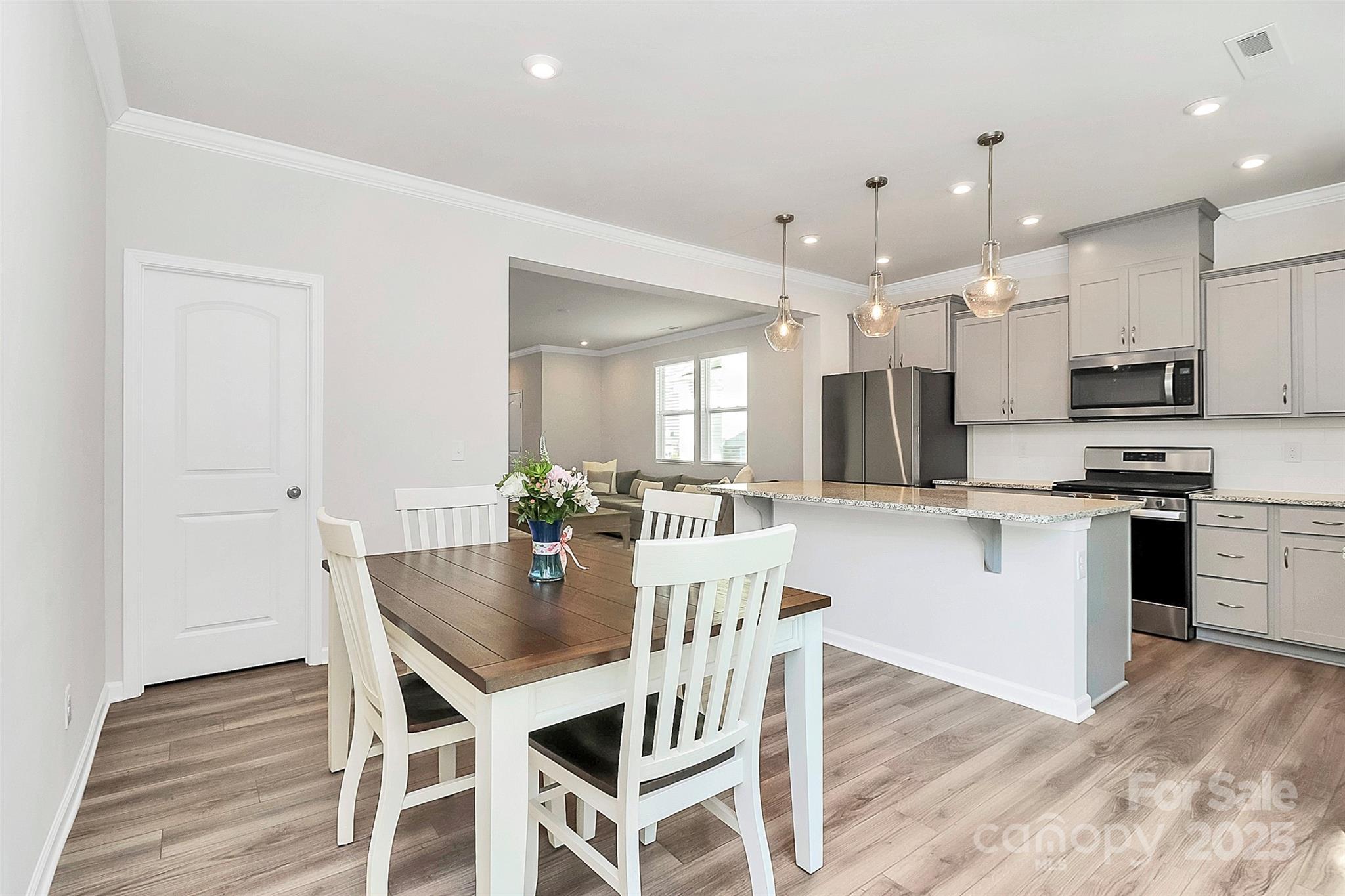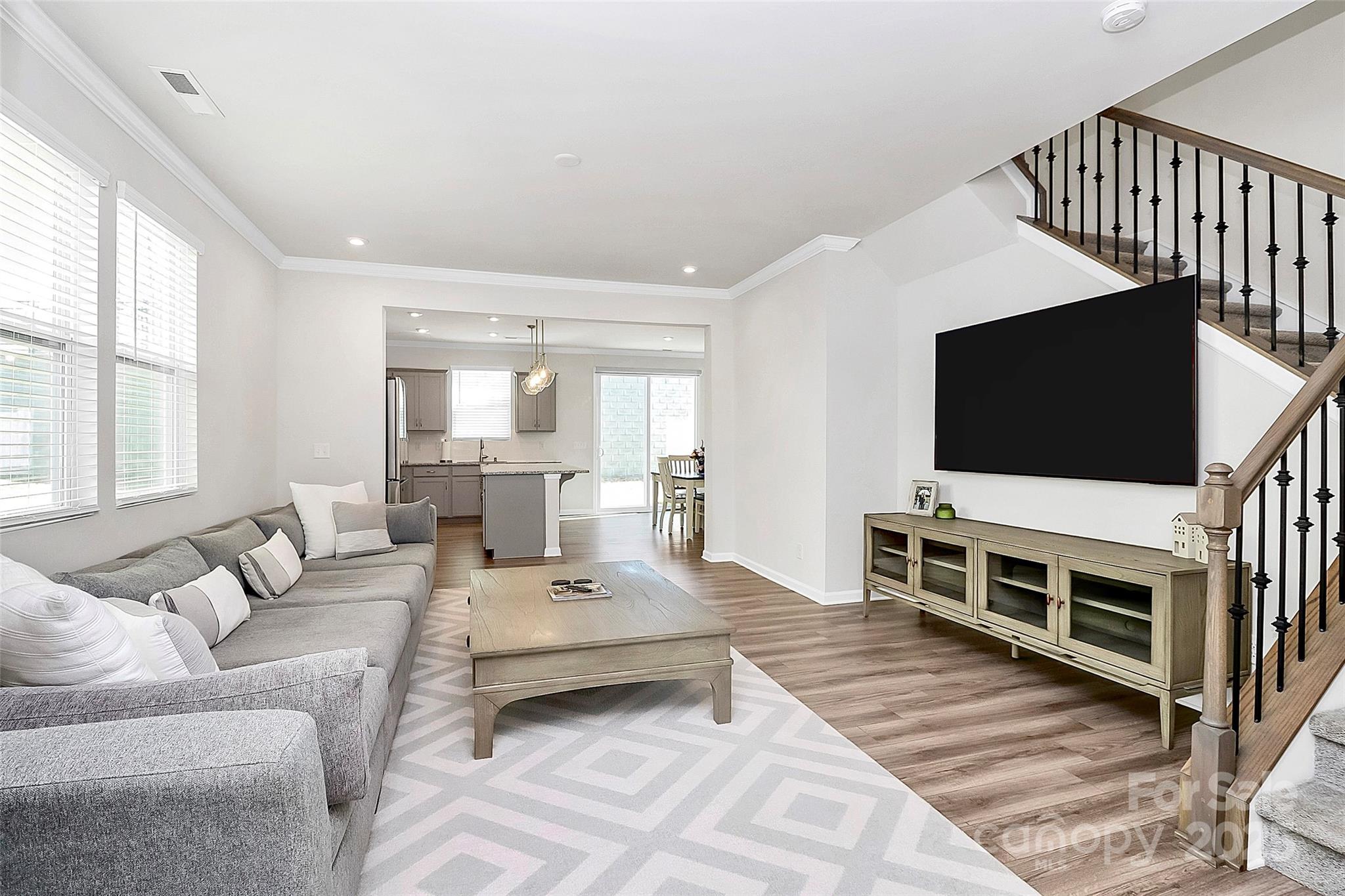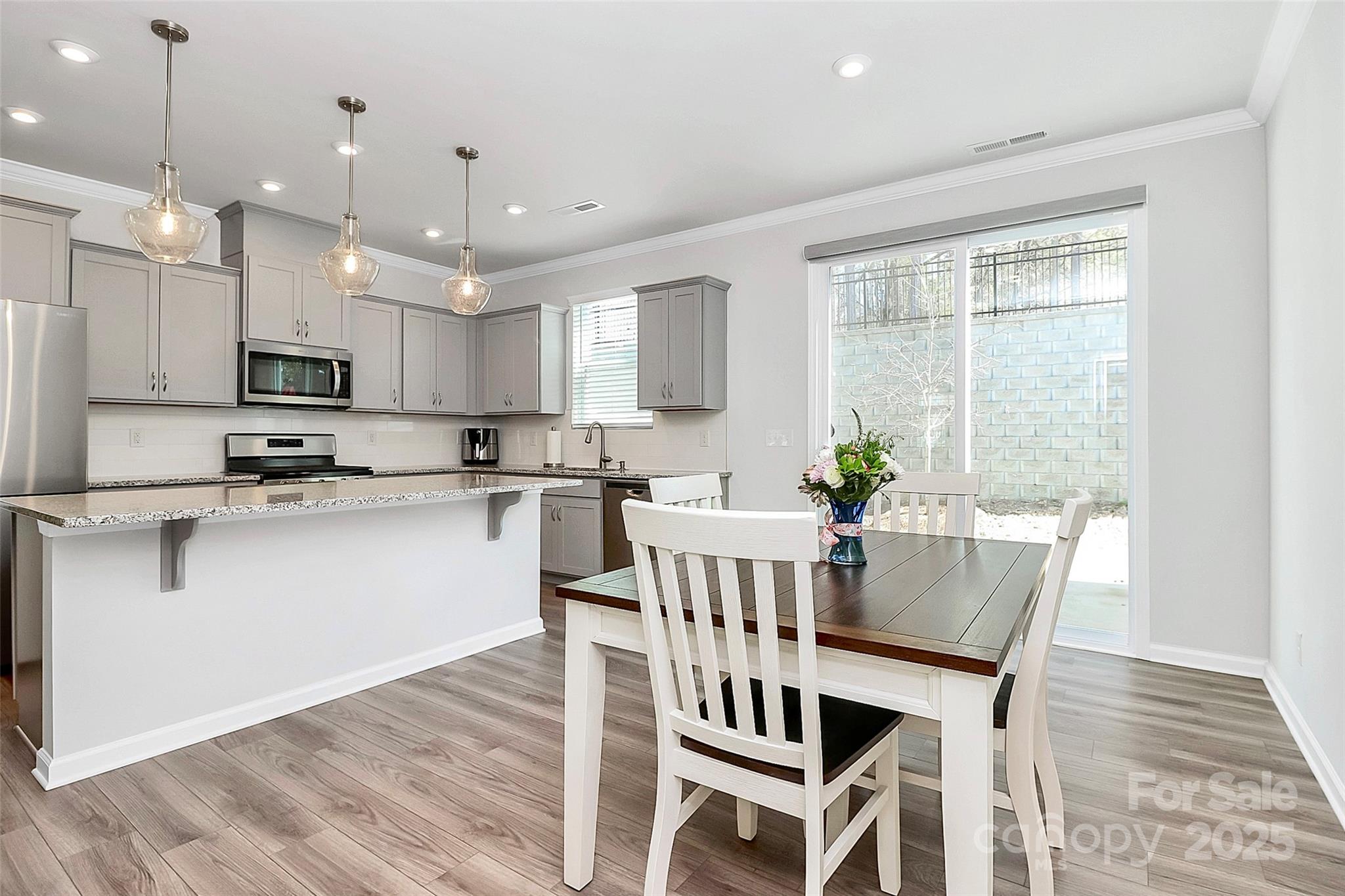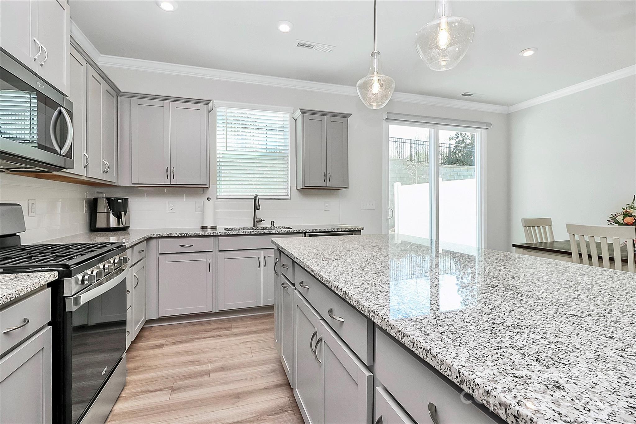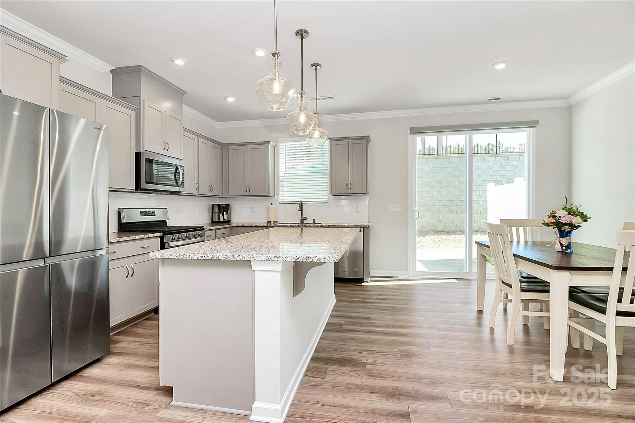 Like-new 3-bedroom, 2.5-bath end-unit townhome with finished 1-car garage and private views! The open layout features stylish LVP flooring on the main level, a spacious gathering room, and a stunning kitchen with gray 42” cabinetry, stainless steel appliances, a large center island with seating, and a sunny breakfast nook. The main floor also includes a generous storage area. Upstairs, wrought-iron railings lead to three bedrooms plus a versatile loft. The owner’s suite offers a spa-like bath, while the private patio is perfect for outdoor relaxation.